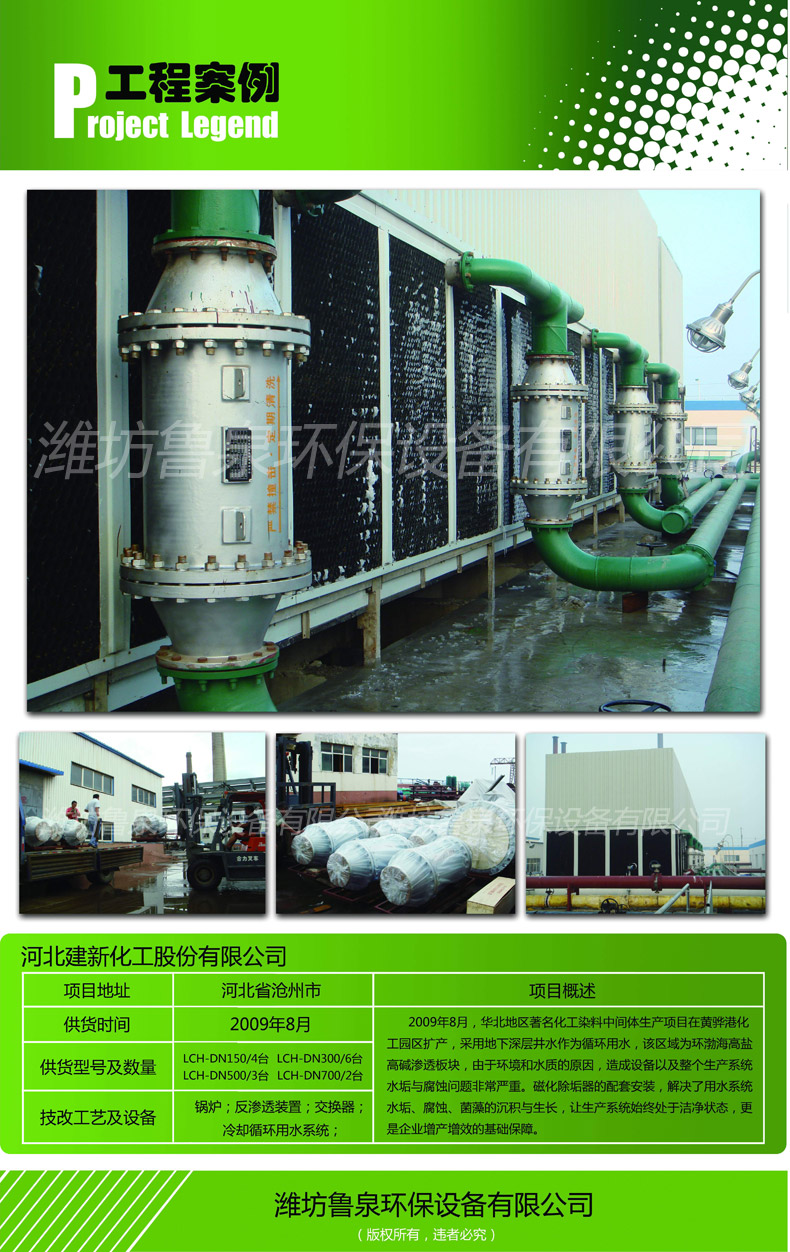 2009年8月,华北地区著名化工染料中间体生产项目在黄骅港化工园区扩产,采用地下深层井水作为循环用水,该区域为环渤海高盐高碱渗透板块,由于环境和水质的原因,造成设备以及整个生产系统水垢与腐蚀问题非常严重。磁化除垢器的配套安装,解决了用水系统水垢、腐蚀、菌藻的沉积与生长,让生产系统始终处于洁净状态,更是企业增产增效的基础保障。